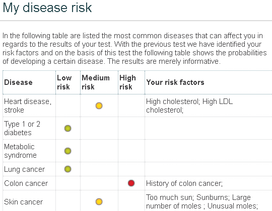 You can update your test later. Once you have completed the test, you will land on a summary page. Here you can check your risk factors and your disease risk – probability that you may develop a certain common disease. Click Go to my Dashboard to proceed.