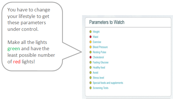 My parameters. Here you can input your weight, height, waist size, hip size, exercise time, blood pressure, resting pulse, cholesterol and glucose. Depending on your values a red, yellow or green light will turn on. Checklists can help you develop and maintain healthy lifestyle habits.