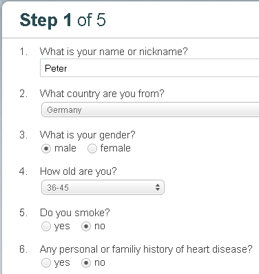 First, you have to register. Then you complete a test consisting of a few questions. Then our expert system calculates and ranks your risk factors. Then it calculates your probability for a certain disease. After that, you gain access to your dashboard. In your dashboard, you can input parameters like weight, waist, exercise minutes per day, blood pressure, resting pulse, cholesterol levels, screening tests etc. Dashboard can help you monitor your lifestyle habits. There you can also find useful checklists like My blood pressure checklist, Healthy food test etc. Discuss your results (risk factors and values of your medical parameters) with your doctor. You can print your dashboard and results or show them on your phone, tablet or computer. This is very helpful for your doctor and can lead to better diagnosis and treatment.